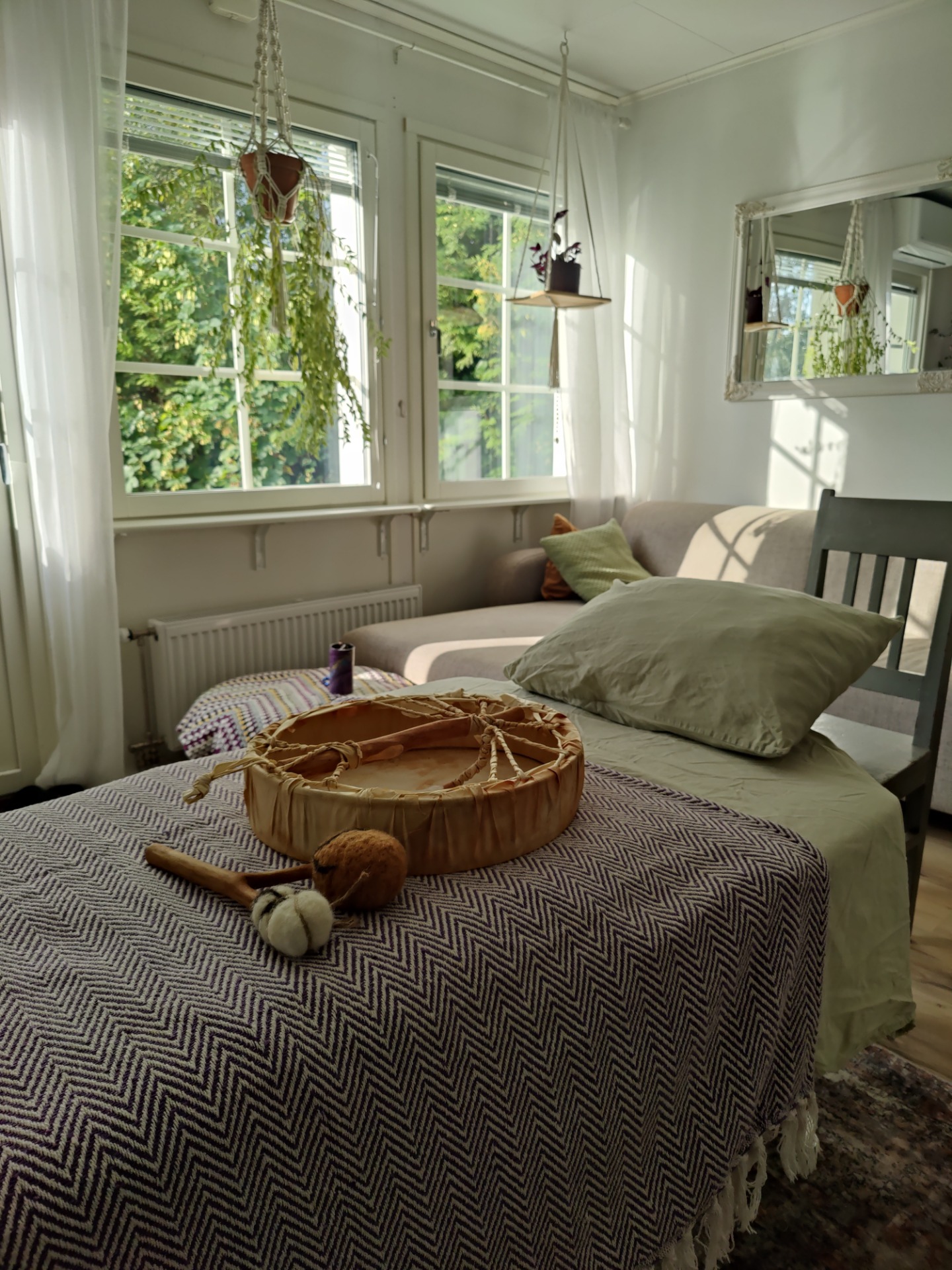 Hoidan aina intuitiivisesti ja hoidettavan toiveita kuunnellen. Hoidon aikana kuljetan rumpua hoidettavan kehon läheisyydessä. Hoidossa soitan itse tekemääni rumpua ja usein käytän rummun lisäksi myös omaa ääntäni. Hoidon alussa ohjaan juurruttavan kehorentoutuksen ja hoito päättyy koshi-kellon kauniisiin säveliin. Hoidon aikana hoidettava makaa lämpimän viltin alla. Hoidon kesto 45min. Varaathan hieman aikaa lisäksi myös alku- ja loppukeskusteluille.