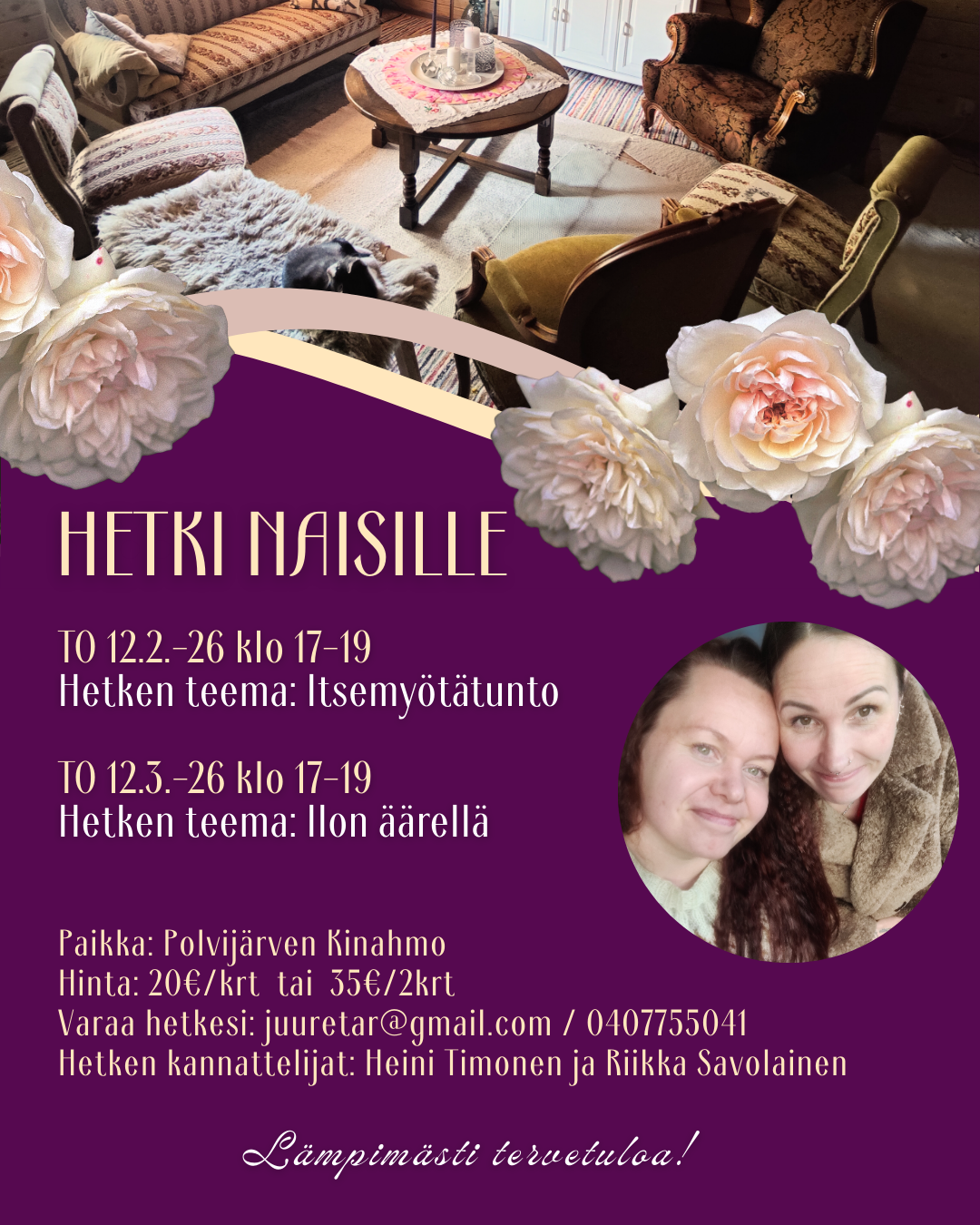 Lämpöisesti tervetuloa mukaan naisten hetkiin 12.2 ja 12.3 klo 17-19 Polvijärven Kinahmoon!